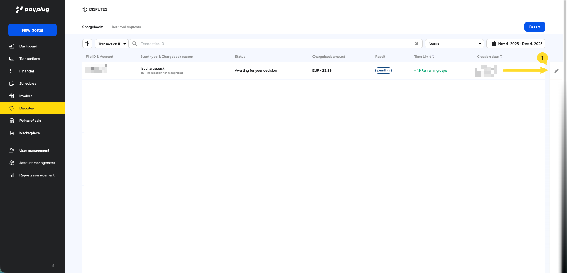 To challenge a dispute, you must first open the corresponding file. To do this, click on the transaction ID or the small edition icon to the right of the screen.