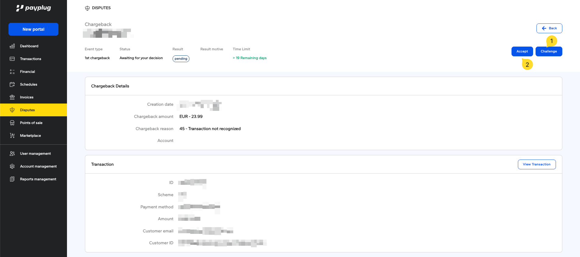 Once the file is open, a "Challenge" button allows you to add the necessary documents and a comment to accompany your challenge request. If you click "Accept," you are agreeing to the dispute, and the refund to the customer will be processed. Associated fees from your Payplug contract will be charged in addition to the total amount.