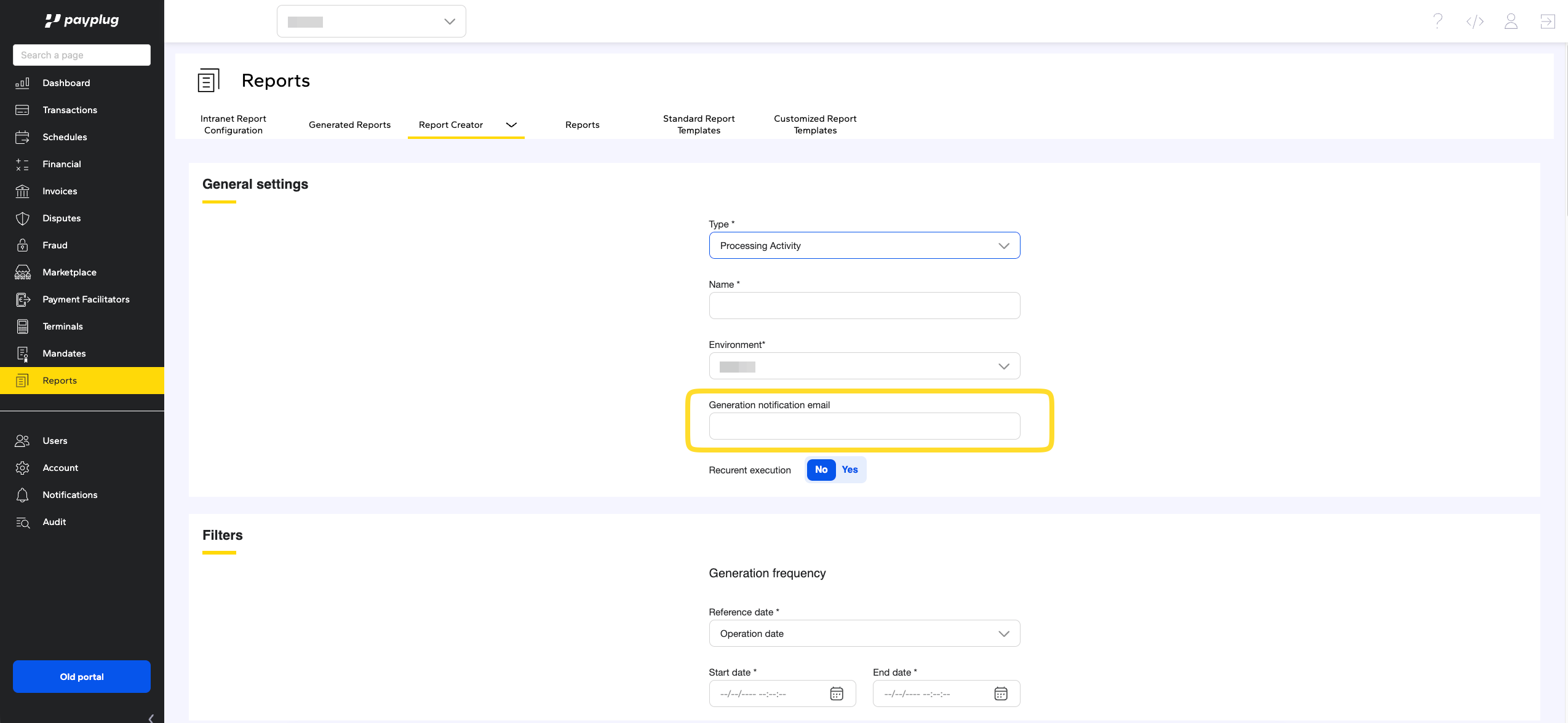 You also have the option to automatically receive your reports (Settlement, Processing, FT Report…) at a defined frequency, daily, weekly, or monthly, by selecting "Yes" in the corresponding setting.