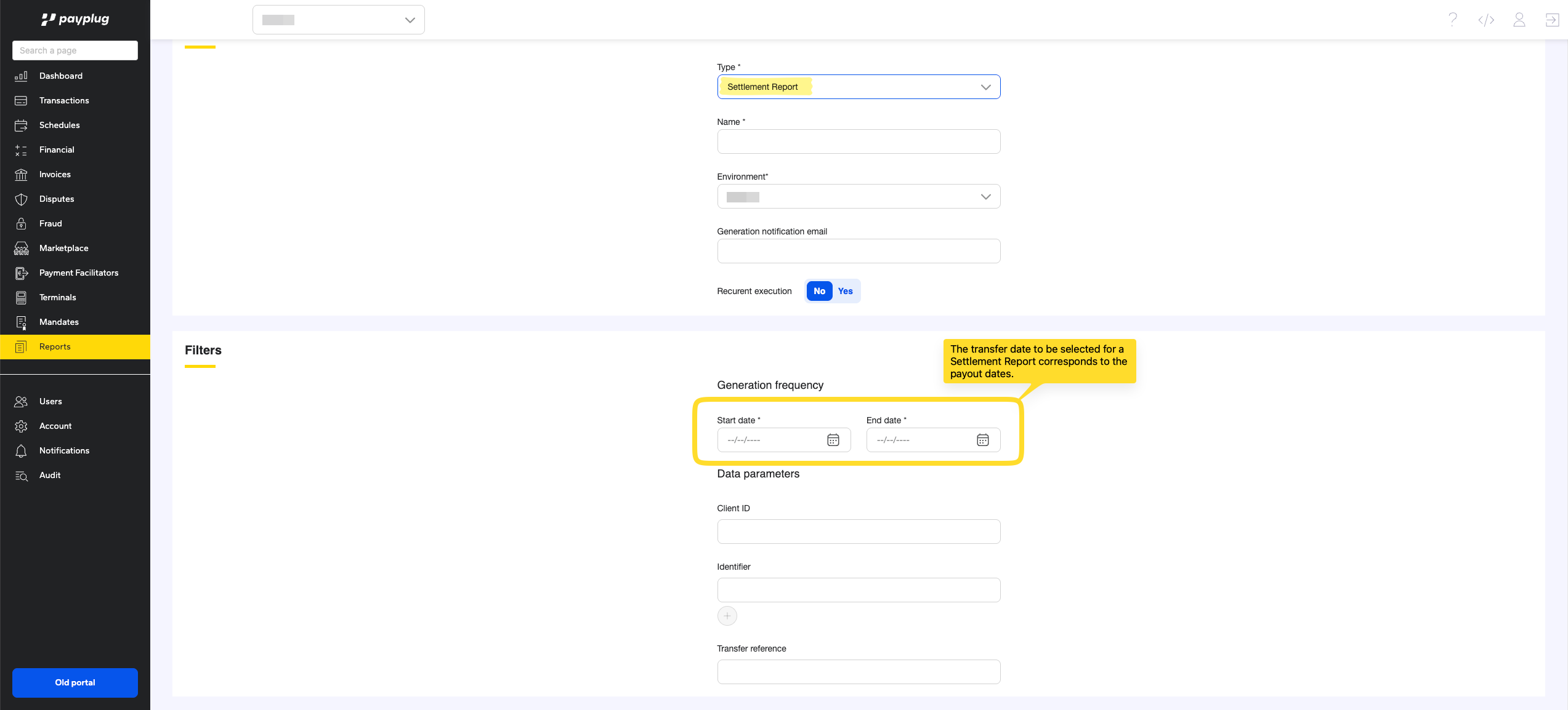 For a Settlement Report, the selected dates correspond to the "transfer date" (payout date).