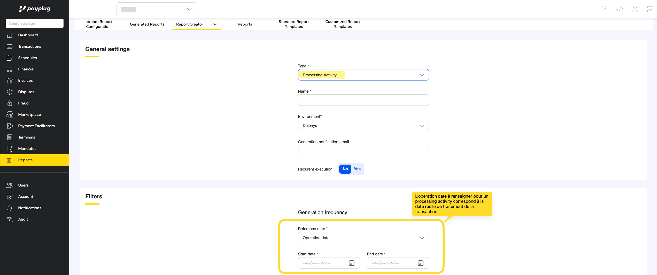 - Pour un Processing Activity, Dispute report ou un FT Report, les dates font référence à l' ”operation date” (date réelle des opérations).