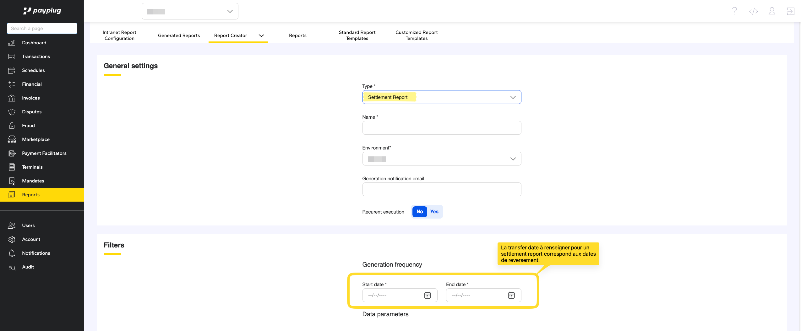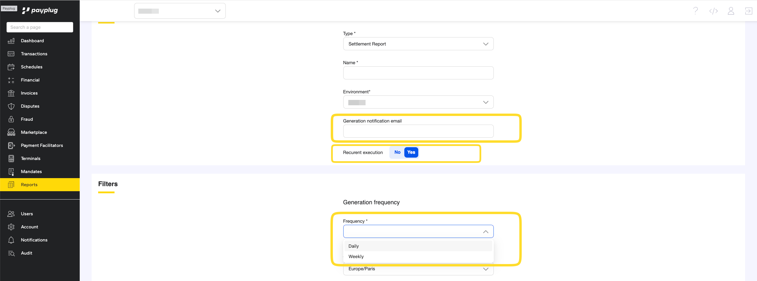 Vous avez également la possibilité de recevoir automatiquement vos rapports (Settlement, Processing, FT Report…) à une fréquence définie — quotidienne, hebdomadaire ou mensuelle, en cochant "Yes" dans le paramètre prévu à cet effet.