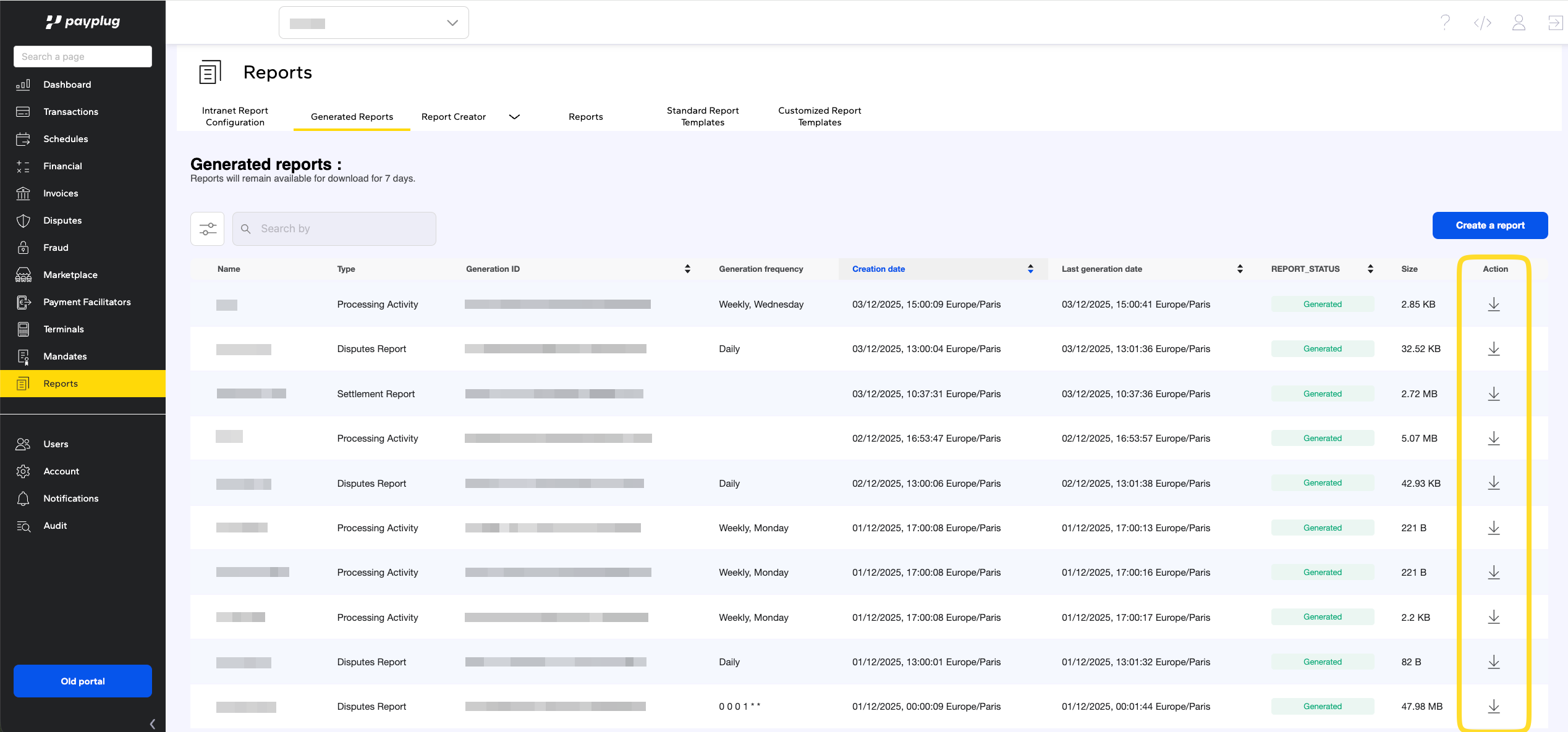 Une fois le rapport généré, il sera disponible en téléchargement depuis l’onglet "Generated reports". Vous pourrez le télécharger au format CSV.