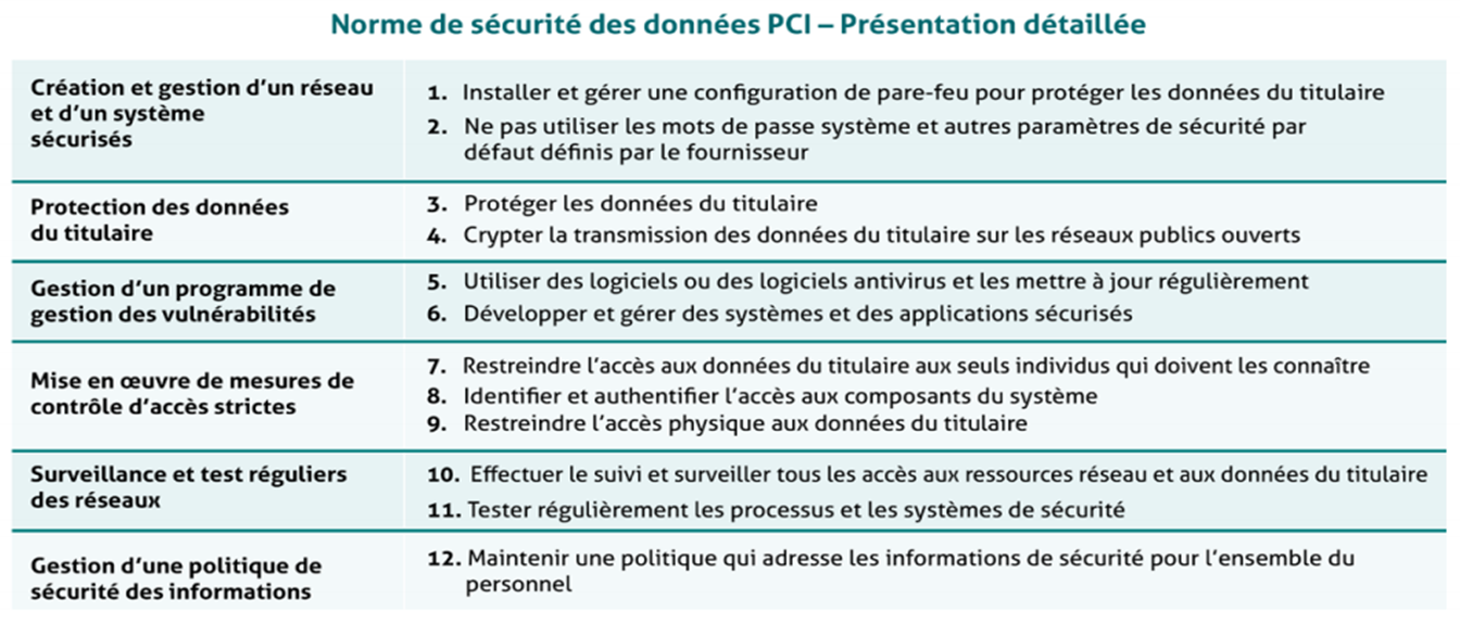 Le standard PCI DSS comprend un ensemble de 12 clauses, détaillées ci-dessous: